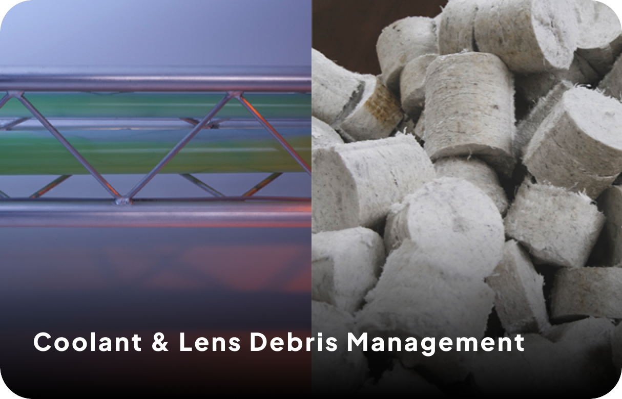 Automated coolant cleaning system, separates liquids from lens debris. Chip & debris compressor drastically reduces waste weight & volume. Microseparator processes up to 600 lenses/hour.