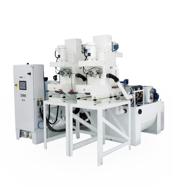 Three independently controlled polishing chambers with two tool spindles per chamber. Processes up to 100 lenses/hour with top speed.