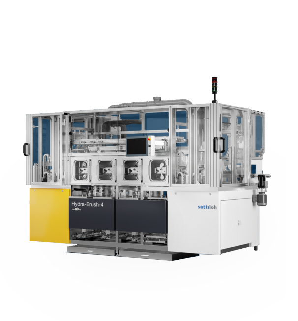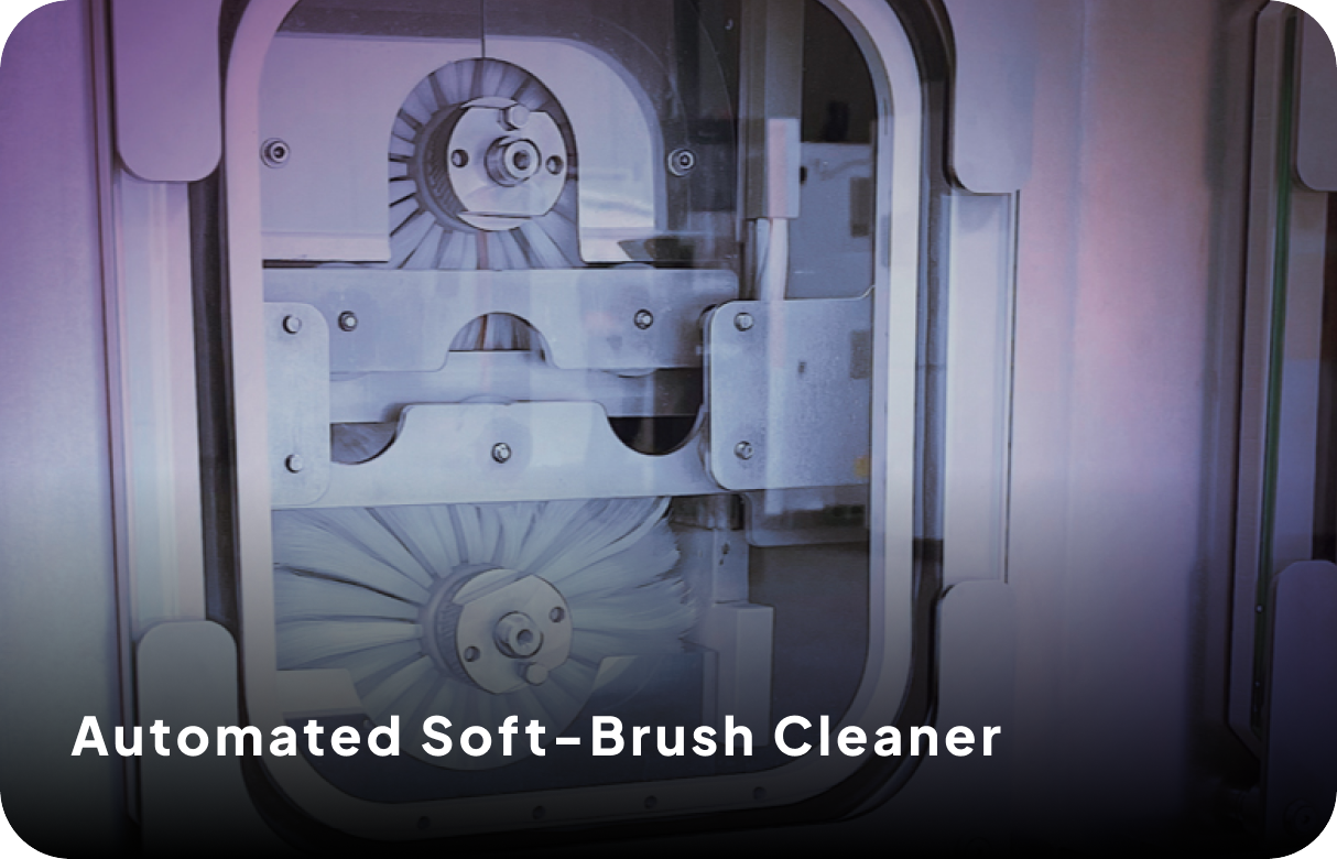 An innovative, compact & fully automated soft brush cleaning system for front and back side of ophthalmic lenses. 4-stage cleaning process for
